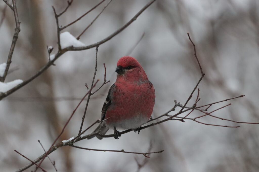 Eleven Nature Guelph members met at the Visitor’s Centre at 9 AM and enjoyed the many birds and squirrels visiting the feeders. There were numerous Blue Jays and Pine Grosbeaks as well as a few Black-capped Chickadees. The group was also treated to the arrival of a Ruffed Grouse that came through the pine trees to feed at the bottom of the feeders. Other species viewed include White-breasted Nuthatch, Downy Woodpecker and American Tree Sparrow.