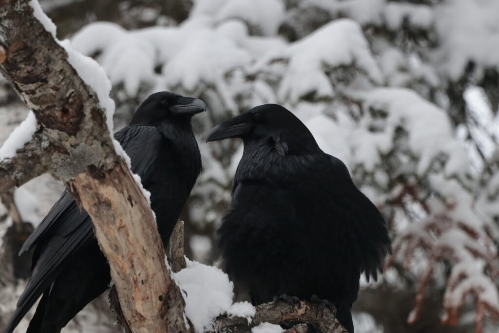 After enjoying the birds at the Visitor Centre, the crew headed over to the Spruce Bog Boardwalk Trail. This popular winter stop is known for a variety of birds including the Spruce Grouse, Canada Jay and Black-backed Woodpecker. This 1.5 km trail did not disappoint. After encountering two charismatic Common Ravens in the parking lot, the group was soon delighted with encounters with Black-capped Chickadees, White-breasted and Red-breasted Nuthatches. As we continued along the loop, we also spotted some Canada Jays in distant trees. These curious creatures also spotted us and came in for a closer look. The birds were banded under an ongoing monitoring program for the species on the Highway 60 corridor; these two in particular are the known pair for the Boardwalk territory, KOSLKOBR (male, 8 years old) and KOSLGOBR (female, 10+ years old). These “names” are unique codes that correspond to the coloured bands that the birds wear on their legs.