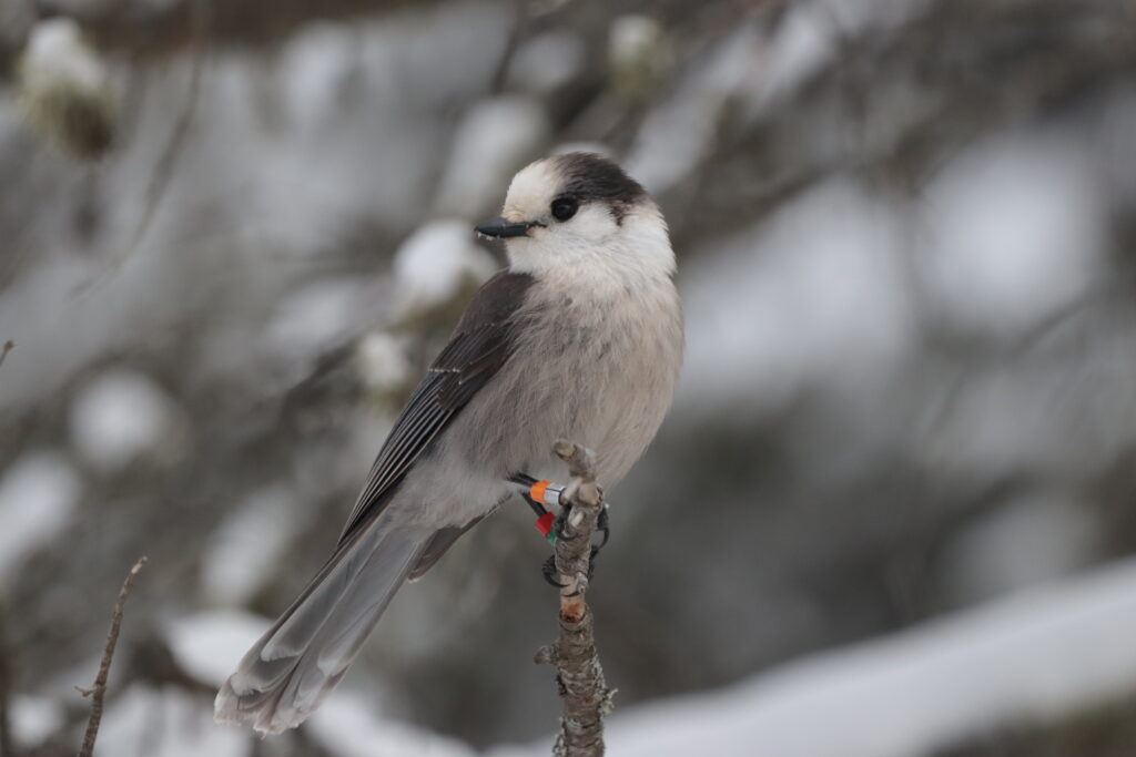 Since 2009, Dr. Ryan Norris (University of Guelph) and his graduate students have been collaborating with Dan Strickland, former Chief Park Naturalist for Algonquin Park, on Canada Jay research in Algonquin Park. Dan began marking Canada Jays in Algonquin and tracking their reproductive success in the mid 1970’s. The marking of Canada Jays is accomplished with specialized colour coded legbands (see below). These legbands are unique to each bird and translate into a name for each bird allowing for long-term and individual studies.
